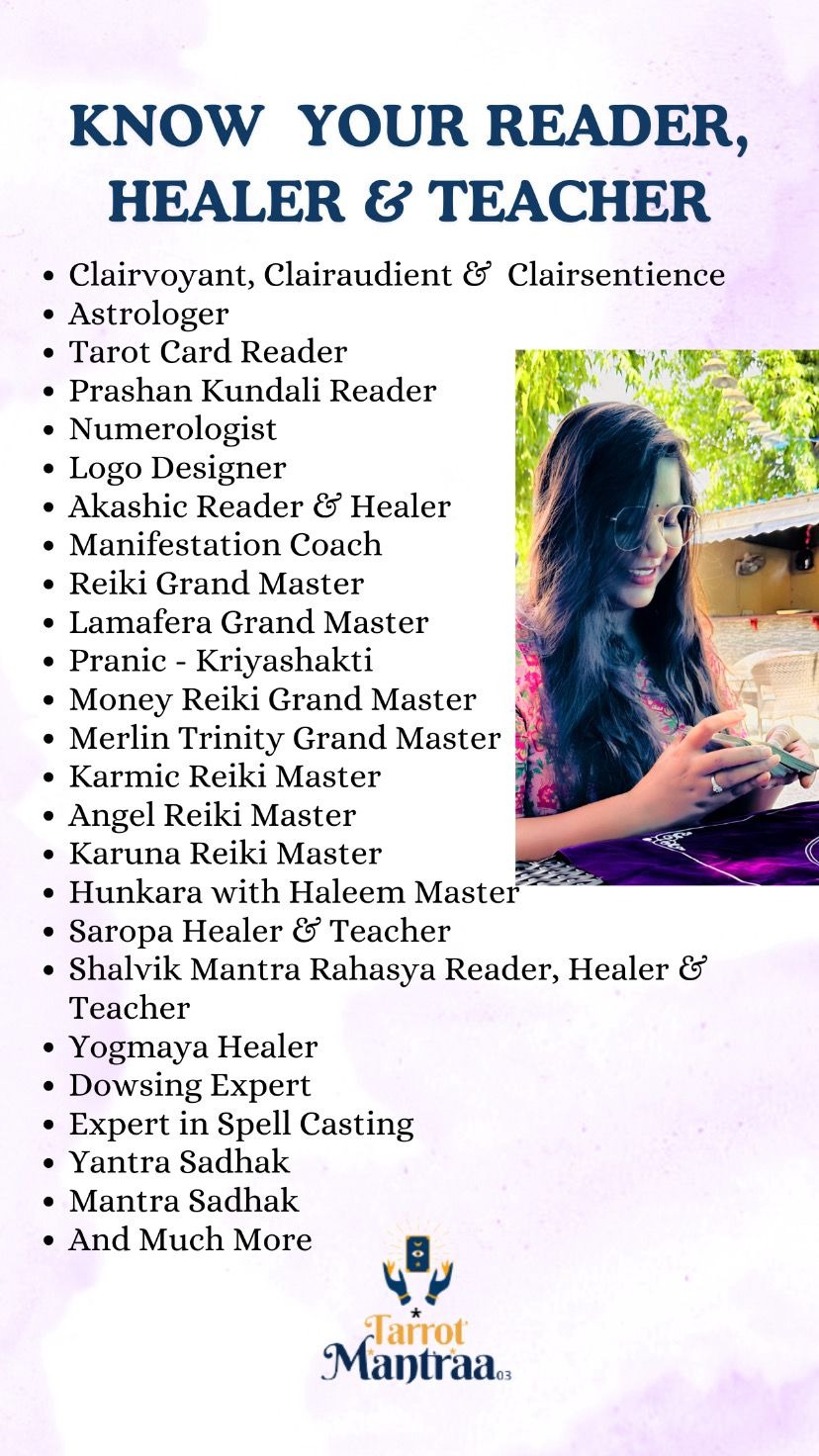 Sometimes they gave me clear answers and sometimes they didn’t. So I decided to move forward and learn tarot card reading for myself to gain more knowledge about this subject. I started to learn this philosophy in September 2019 with the help of many online and offline courses. After that, I practiced Tarot Card Reading for 3 months for my closed ones. Later on, when I became confident in my study, I decided to practice Tarot readings for others as well and guide them well. In between my journey towards learning the study, I learned many Healing modalities along with it. I'm grateful for the universe that it selected me to heal others and help them.